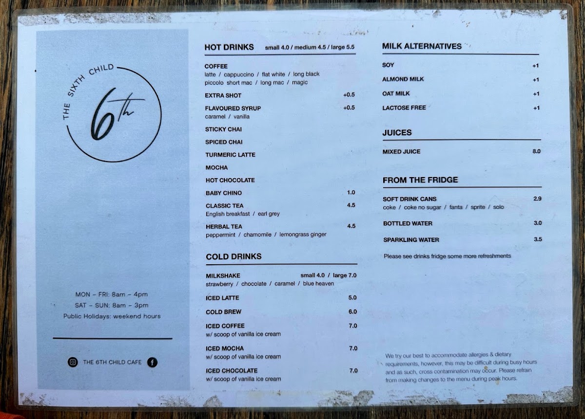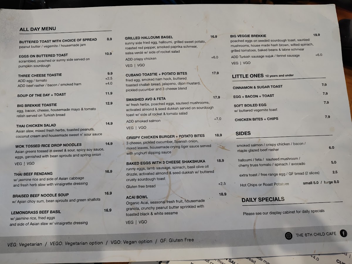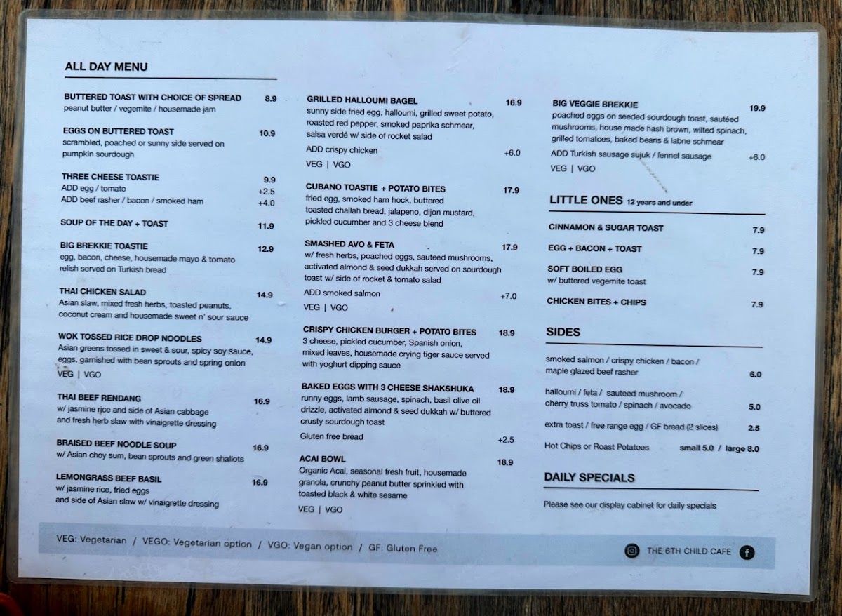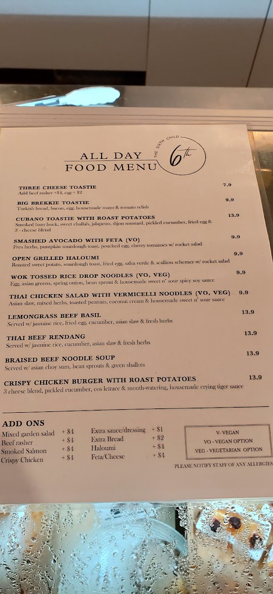 The menu at The 6th Child Cafe features a selection of all-day mains, light meals, and a range of coffee and teas suitable for breakfast, lunch, or casual dining. It offers a blend of Asian-inspired dishes along with café classics, allowing guests to choose from diverse meal options throughout the day.